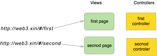 http://web3.xin/#/first http://web3.xin/#/second http://web3.xin/#/third当我们点击以上的任意一个链接时,向服务端请的地址都是一样的 (http://web3.xin/)。 因为 # 号之后的内容在向服务端请求时会被浏览器忽略掉。 所以我们就需要在客户端实现 # 号后面内容的功能实现。 AngularJS 路由 就通过 # + 标记 帮助我们区分不同的逻辑页面并将不同的页面绑定到对应的控制器上。