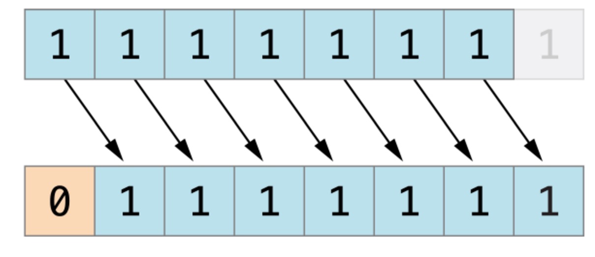 下图展示了11111111 << 1(11111111 左移一位)的结果。蓝色数字表示被移动位,灰色表示被丢弃位,空位用橙色的0填充。 ![]() |