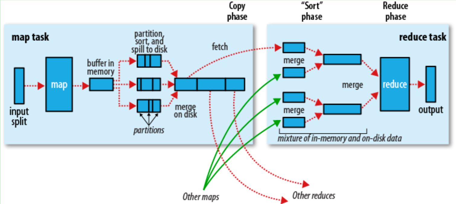 每个Map任务都有一个循环内存缓冲区(默认100MB),当缓存的内容达到80%时,后台线程开始将内容写到文件,此时Map任务可以&#x#x7EE7;续输出结果,但如果缓冲区满了,Map任务则需要等待