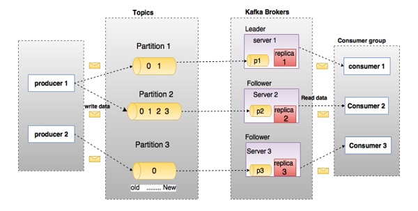 在上图中,主题配置为三个分区。 分区1具有两个偏移因子0和1.分区2具有四个偏移因子0,1,2和3.分区3具有一个偏移因子0.副本的id与承载它的服务器的id相同。