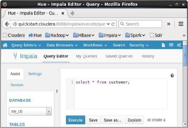 打开Impala查询编辑器并键入其中的select语句。 然后单击执行按钮,如下面的屏幕截图所示。