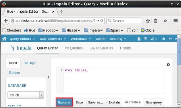 打开impala查询编辑器,选择上下文为my_db并键入其中的show tables语句,然后单击执行按钮,如下面的屏幕截图所示。