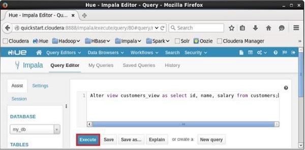 打开Impala查询编辑器,选择上下文为my_db,并在其中键入Alter View语句,然后单击执行按钮,如下面的屏幕截图所示。