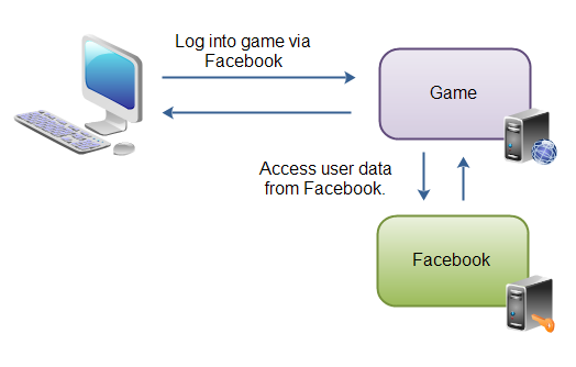 用户访问web游戏应用,该游戏应用要求用户通过Facebook登录。用户登录到了Facebook,再重定向会游戏应用, 游戏应用就可以访问用户在Facebook的数据了,并且该应用可以代表用户向Facebook调用函数(如发送状态更新)。