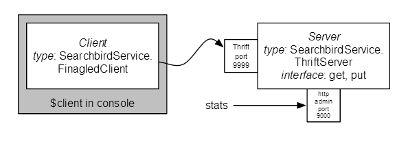 $ ./sbt ... > compile > run -f config/development.scala ... [info] Running com.twitter.searchbird.Main -f config/development.scala配置文件 (development.scala) 实例化一个新的服务,并监听 9999 端口。客户端可以连接到 9999 端口使用此服务。