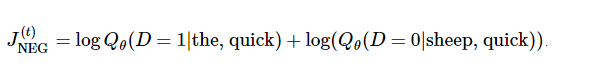假设用 t 表示上面这个例子中quick 来预测 the 的训练的单个循环。用 num_noise 定义从噪声分布中挑选出来的噪声(相反的)单词的个数,通常使用一元分布,P(w)。为了简单起见,我们就定num_noise=1,用 sheep 选作噪声词。接下来就可以计算每一对观察值和噪声值的损失函数了,每一个执行步骤就可表示为:
