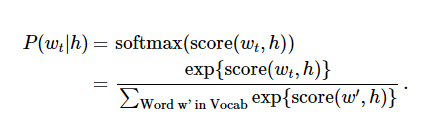 这里提出了一个解决语言概率模型的合适的通用方法。然而这个方法实际执行起来开销非常大,因为我们需要去计算并正则化当前上下文环境 h 中所有其他 V 单词 w' 的概率得分,在每一步训练迭代中。