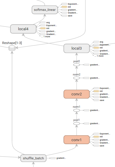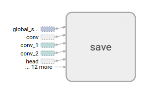 save has a high degree, 并会作为从属节点出现,与conv_1的连接作为一个节点图标显示在其左边。为了继续减少杂乱,既然save有很多连接,我们则只显示前5个,而把其余的缩略为... 12 more。