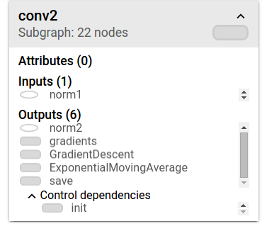详情卡片展示conv2名称域的详细信息,名称域中操作节点的输入和输出被结合在一起,适用于不显示属性的名称域。