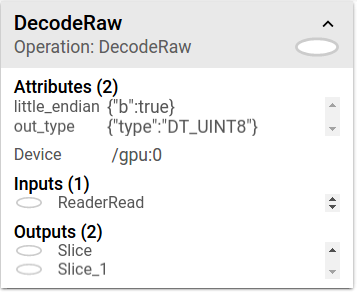 详情卡片展示DecodeRaw操作节点,除了输入和输出,卡片也会展示与当前节点相关的设备和属性。