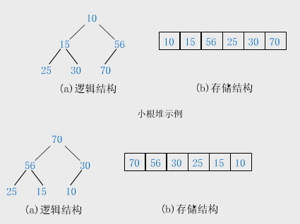 【例】关键字序列(10,15,56,25,30,70)和(70,56,30,25,15,10)分别满足堆性质(1)和(2),故它们均是堆,其对应的完全二叉树分别如小根堆示例和大根堆示例所示。