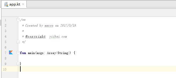 在创建了文件以后,需要编写主程序(main),这是Kotlin应用程序的入口点。IntelliJ IDEA提供了一个快速完成此操作的模板。只需键入main和按tab键就自动完成。