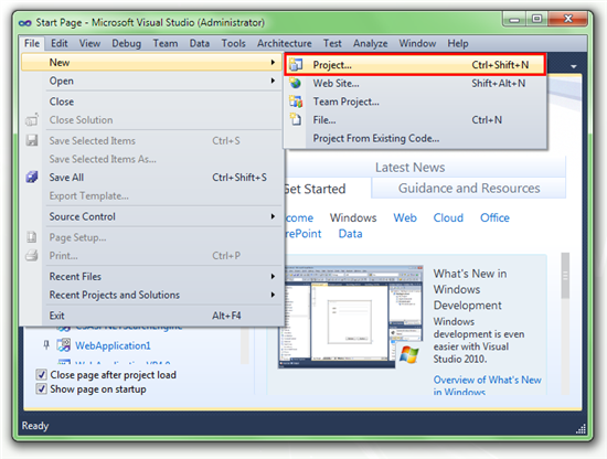 以管理员权限打开 Visual Studio 2010,点击 File,选择 New,点击 Project按钮: