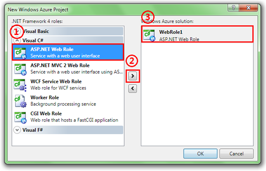 在弹出窗口出现后,按照下图所示,分别点击 ASP.NET Web Role, “ >”按钮。该步骤会在右边窗口中生成一个新的 WebRole项。点击 OK。