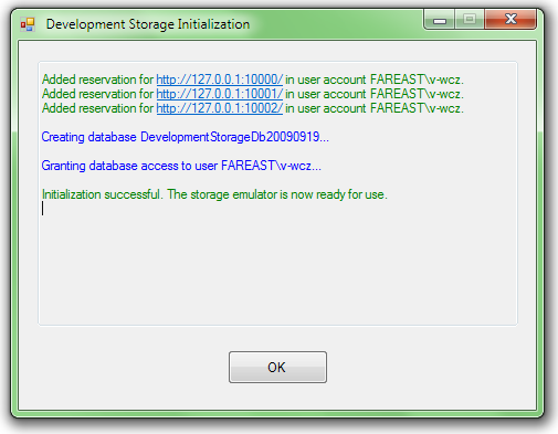 按 F5键开始调试程序。如果你是第一次运行 Windows Azure项目,你将会见到 Development Storage初始化的窗口,直接点击 OK按钮: