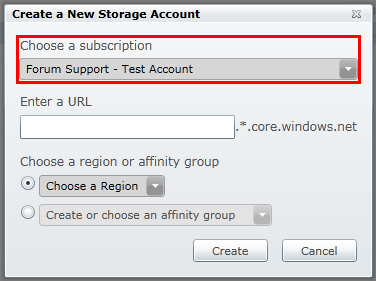 在 Create a New Storage Account对话框里,在标记为 Choose a subscription 的下拉框里选择一个订阅选项: