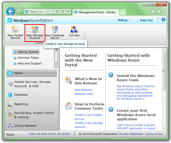 使用支持 SilverLight的浏览器打开 https://windows.azure.com/。 (注意:您可能需要输入您的 Live ID和密码来通过身份验证 ) 点击 New Storage Account: