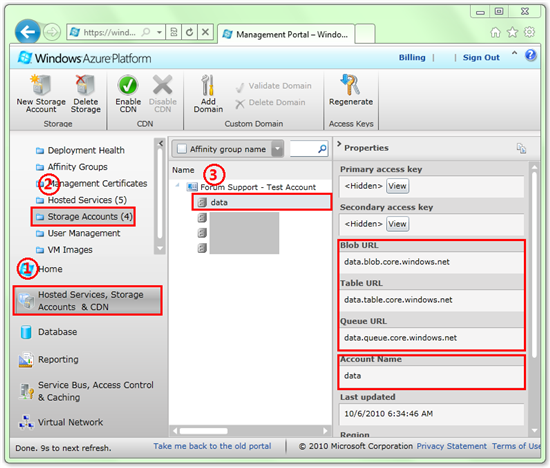 最后点击 Create按钮完成创建。等待创建过程完成后,我们可以看到系统给我们分配了 3个 URL,分别是 Blob URL、 Table URL和 Queue URL,以及刚才我们自己输入的用户名。