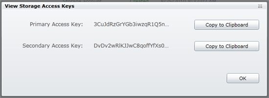 然后点击属性栏里的 Primary access key或者 Secondary access key可以看到这些 key的值。点击 View Storage Access Keys对话框里的 Copy to Clipboard按钮就可以拷贝到粘贴板里了。