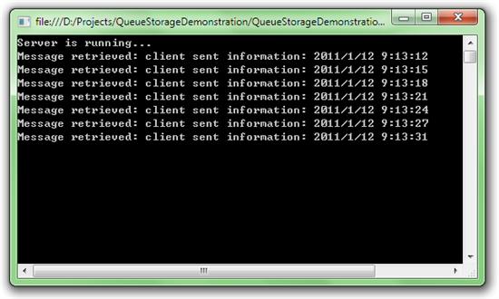 Client项目中的代码相对简单。大约每隔 3秒向 Queue Storage中插入一条数据。 Server端的项目中我们则大约每隔 3秒从 Queue Storage中读取一条数据。处理完毕后将之删除。对于为什么必须在读取后显示删除的问题请参考注释部分。