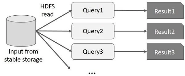 重复使用多个计算中间结果在多级的应用程序。下图说明了如何在当前的框架工作,同时做迭代操作上的MapReduce。这会带来大量的开销,由于数据复制,磁盘I / O,和系列化,使系统变慢。
