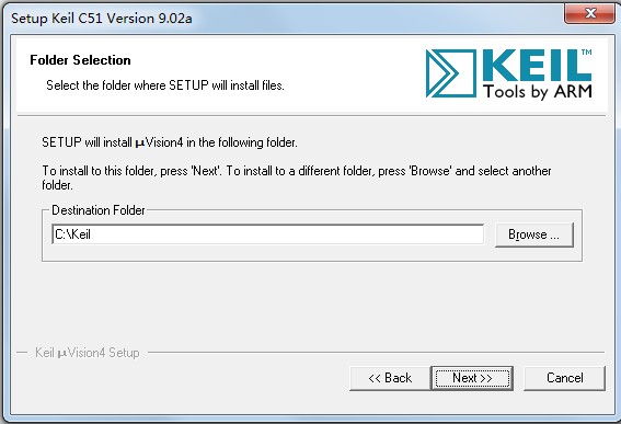 3) 点击“Next”按钮,弹出“Folder Selection”对话框,如图1-3所示。这里可以设置安装路径,默认安装路径在“C:\Keil”文件夹下。点击“Browse...”按钮,可以修改安装路径,这里建议大家用默认的安装路径,如果你要修改,也必须使用英文路径,不要使用包含有中文字符的路径。