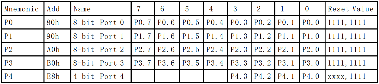 其中 P0 口所在的地址是 0x80,一共有从7到0这8个 IO 口控制位,后边有个 Reset Value(复位值),这个很重要,是我们看寄存器必看的一个参数,8个控制位复位值全部都是1。