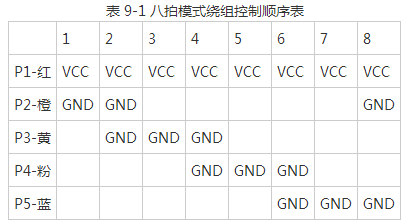 那么如果要导通 A 相绕组,就只需将橙色线接地即可,B 相则黄色接地,依此类推;再根据上述单四拍和八拍工作过程的讲解,可以得出下面的绕组控制顺序表,如表9-1所示: