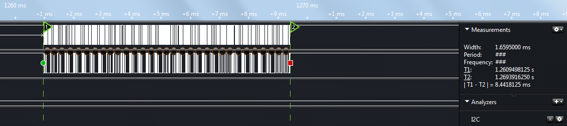 多字节写入和页写入程序都编写出来了,而且页写入的程序我们还特地跨页写的数据,它们的写入时间到底差别多大呢。我们用一些工具可以测量一下,比如示波器,逻辑分析仪等工具。我现在把两次写入时间用逻辑分析仪给抓了出来,并且用时间标签 T1 和 T2 标注了开始位置和结束位置,如图14-5和图14-6所示,右侧显示的|T1-T2|就是最终写入5个字节所耗费的时间。