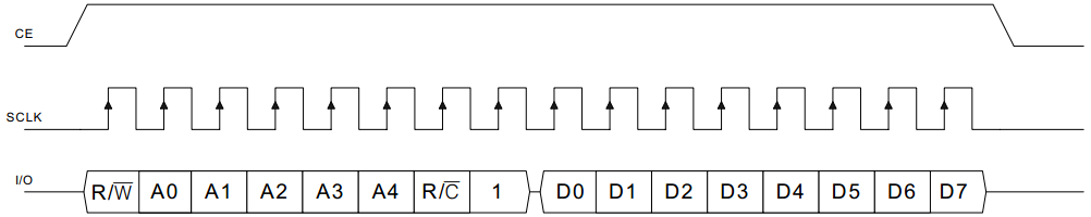 对于单字节读操作,我就不做对比了,把 DS1302 的时序图贴出来,大家自己看一下即可,如图15-13所示。