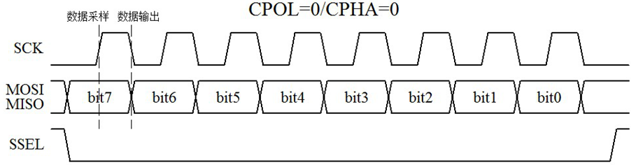 然后我们再对比一下 CPOL=0/CPHA=0 情况下的 SPI 的操作时序,如图15-12所示。