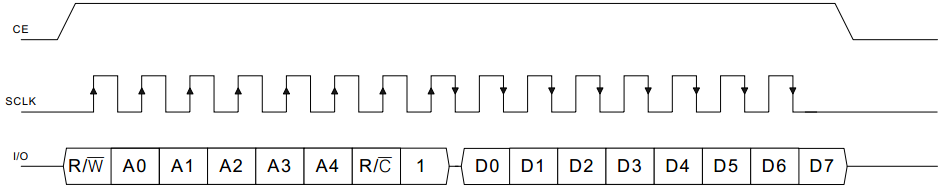 读操作有两处需要特别注意的地方。第一,DS1302 的时序图上的箭头都是针对 DS1302 来说的,因此读操作的时候,先写第一个字节指令,上升沿的时候 DS1302 来锁存数据,下降沿我们用单片机发送数据。到了第二个字数据,由于我们这个时序过程相当于 CPOL=0/CPHA=0,前沿发送数据,后沿读取数据,第二个字节是 DS1302 下降沿输出数据,我们的单片机上升沿来读取,因此箭头从 DS1302 角度来说,出现在了下降沿。