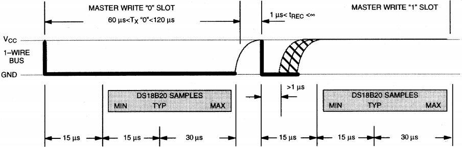 4)DS18B20 的位读写时序 DS18B20 的时序图不是很好理解,大家对照时序图,结合我的解释,一定要把它学明白。写时序图如图16-17所示。
