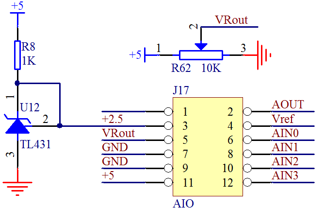 Vref 基准电压的提供有两种方法。一是采用简易的原则,直接接到 VCC 上去,但是由于 VCC 会受到整个线路的用电功耗情况影响,一来不是准确的 5 V,实测大多在 4.8 V 左右,二来随着整个系统负载情况的变化会产生波动,所以只能用在简易的、对精度要求不高的场合。方法二是使用专门的基准电压器件,比如 TL431,它可以提供一个精度很高的 2.5 V 的电压基准,这是我们通常采用的方法。如图17-4所示。
