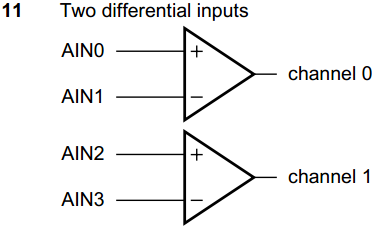 当控制字的第4位和第5位都是1的时候,那么4路模拟被配置成2路差分模式输入 channel 0 和 channel 1。我们以 channel 0 为例,其中 AIN0 是正向输入端,AIN1 是反向输入端,它们之间的信号输入是幅度相同,极性相反的信号,通过减法器后,得到的是两个输入通道的差值,如图17-10所示。