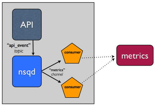 nsqd 实例队列事件,而不是写到指标系统。能够容易的内审和操作流,我们通常将数据格式化为 line-oriented JSON。写到 nsqd 可以简单的执行一个 HTTP post 请求到 /put 端点。
