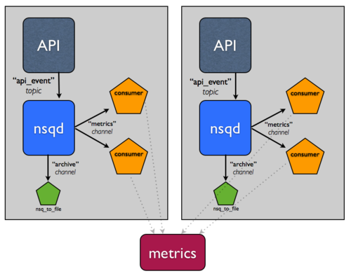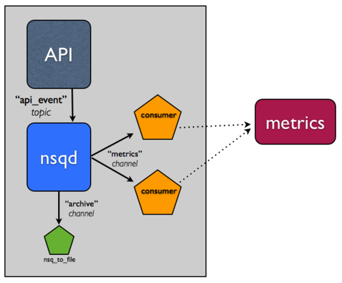 记住,在 NSQ 中,每个话题(topic)的通道(channel)是独立的,并且接收所有消息的拷贝。你可以利用这个特性,来完成流的归档。实际上,这意味着如果你的指标系统已经有这些问题,并且 metrics 通道得到支持,它就不会影响到独立的 archive 通道,你将会持久化消息到磁盘。