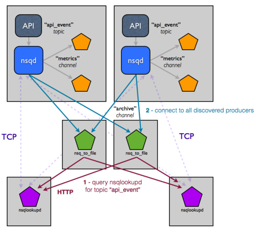 乍一看,这个图变复杂了。这图具有误导性,整个图节点变多了,导致很难直接通讯。因为 nsqlookupd 能作为文件夹服务,你能高效的把生产者和消费者解耦。依赖于已有的流添加一个下行服务非常简单,只需指定你感兴趣的话题(topic)(通过 nsqlookupd 可以找到生产者)。