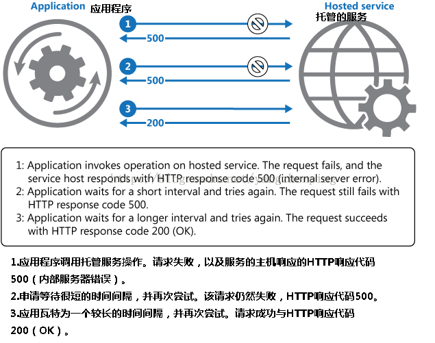 图1示出了这种模式。如果尝试后的预定数量的请求不成功,应用程序应将故障为异常,并相应地处理它。