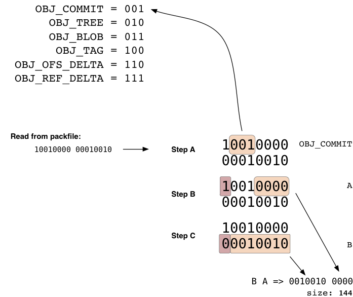 这里我们举一个由两个字节组成的头部的例子。第 1 个字节的前 3 位说明了数据的类型是提交(commit),余下的 4 位和第 2 个字节的 7 位组成的数字是 144,说明数据展开后的长度是 144 字节。