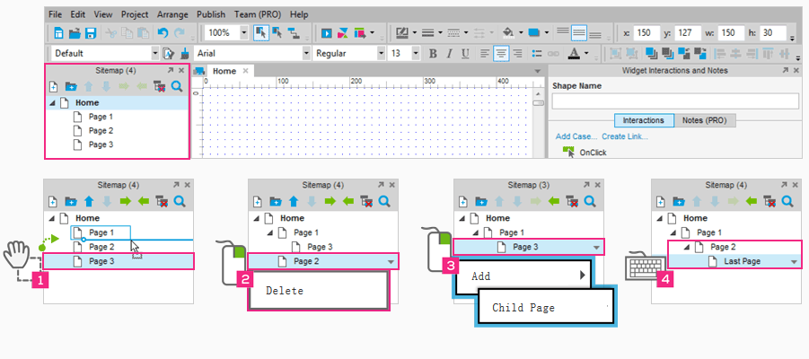 在 Sitemap 添加和组织页面,设置网格和辅助线,和设置单个页面或所有页面的样式。