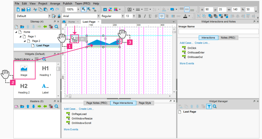 拖动"部件库"窗口的一个图像部件,当左边缘在 X:90 处对齐辅助线和上边缘在 Y:35 处对齐辅助线时放置图像部件。
