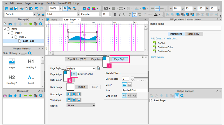 预览你的原型。Sitemap 的变化反映在原型的 Sitemap 上。注意你所有的页面上的背景颜色已经改变,因为我们在页面样式编辑器改变了默认风格。图像部件在“最后一页”。