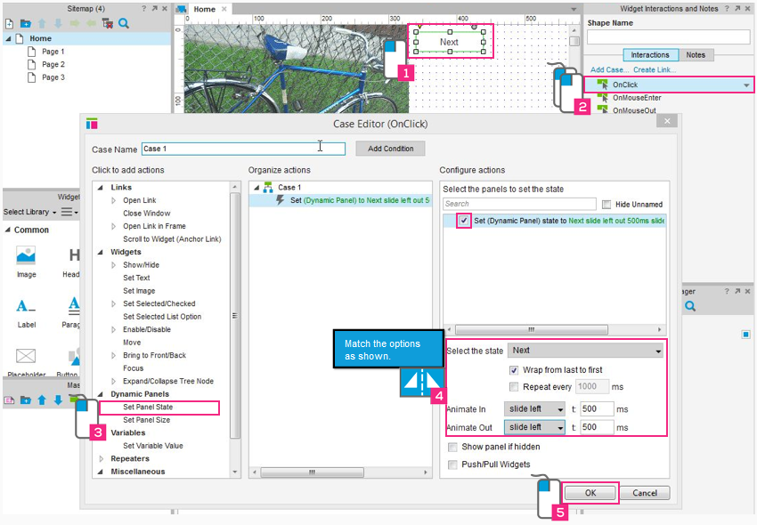 使用“动态面板”创建一个简单的图像旋转。首先将图像小部件放置在每个面板的状态。然后,添加一个交互 Button Shape 使状态能够生动起来。
