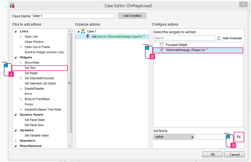 创建“条件”,以检查一个文本字段中的文本是否是空白,基于输入链接到相应的页面。 使用一个变量来存储文本框输入的文本。然后,使用变量设置部件在下一个页面上的文本上。