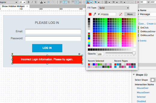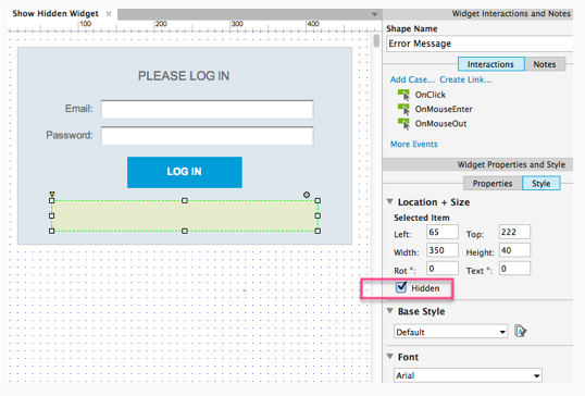 添加第二个事例到 OnClick 事件,并起名为 Failed Login。接着添加动作 Show,选中 Error Message,点 OK。
