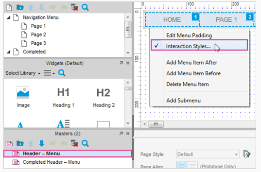 首先打开AxureNavigationMenu.rp 然后从 Masters 页面打开 Header – Menu 。