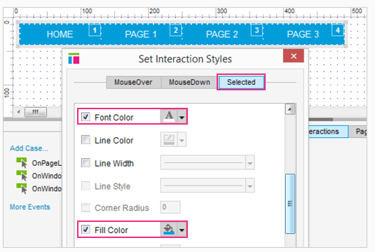 就像我们为 Home 页面所做的,通过相同的菜单为第一到三页面添加一个 OnPageLoad 事例到它们的 selected style。例如,页面 1 的 OnPageLoad 事例,设置 Nav – Page 1 到它的 selected style ,然后为 Page 2 和 Page 3 使用相同的操作。