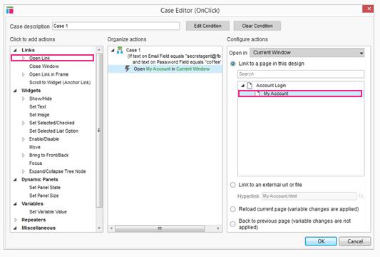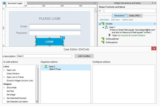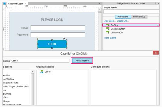 选择登录按钮,并添加一种 Case 到 OnClick 事件。在编辑器中,单击“添加条件”按钮。
