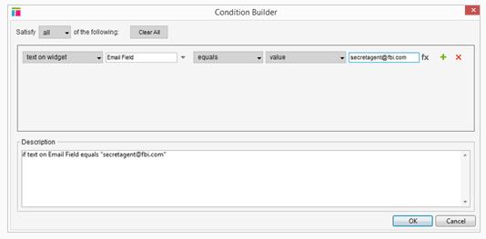 在条件构建器中,使用下拉目录和文本字段配置第一行条件为“如果文本部件电子邮件字段等于 secretagent@fbi.com”